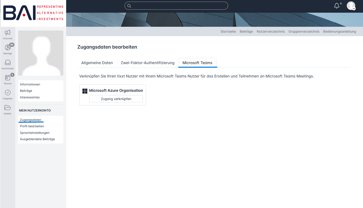 Gehen Sie dazu einfach auf Ihr Profilbild und dann auf Zugangsdaten. Dort finden Sie nun auch noch den Reiter Microsoft Teams und können die Konten miteinander verknüpfen.